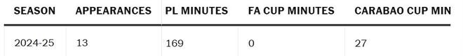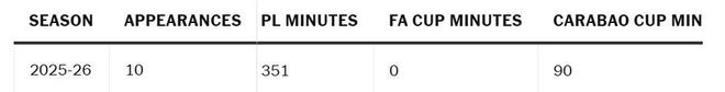 自阿昌庞上次参加英超比赛以来,他还有另外四次出场——在卡拉宝杯4-3战胜狼队的比赛中踢满90分钟,外加三次欧冠出场,包括周二晚上对阵亚特兰大的比赛中首次在该赛事首发。